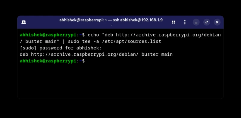 echo "deb http://archive.raspberrypi.org/debian/ buster main" | sudo tee -a /etc/apt/sources.list