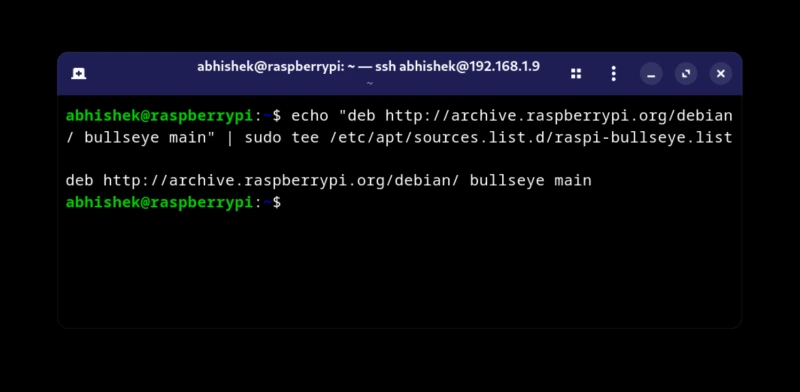 echo "deb http://archive.raspberrypi.org/debian/ bullseye main" | sudo tee /etc/apt/sources.list.d/raspi-bullseye.list