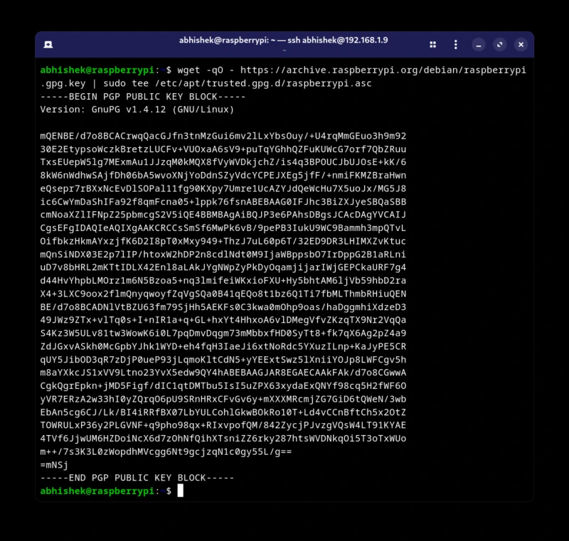 Эта команда указывает Ubuntu доверять пакетам, подписанным этим ключом. Без нее вы можете столкнуться с ошибками при обновлении или установке пакетов из репозитория Raspberry Pi.