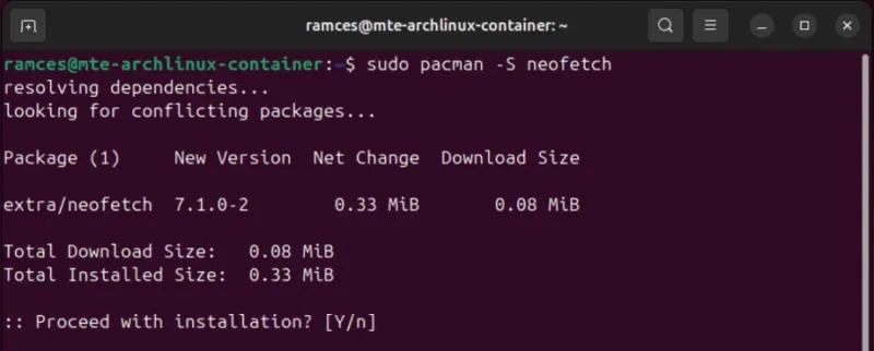 Используйте менеджер пакетов вашего гостевого дистрибутива для установки нужной вам программы. В данном случае я выполню команду sudo pacman -S neofetch