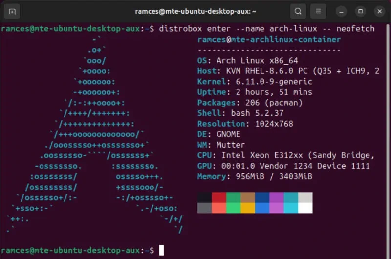 Эта возможность распространяется и на запуск программ за пределами вашей гостевой системы. Например, следующая команда запустит neofetch в гостевой системе Arch Linux и отобразит ее результаты в хост-системе Ubuntu:
