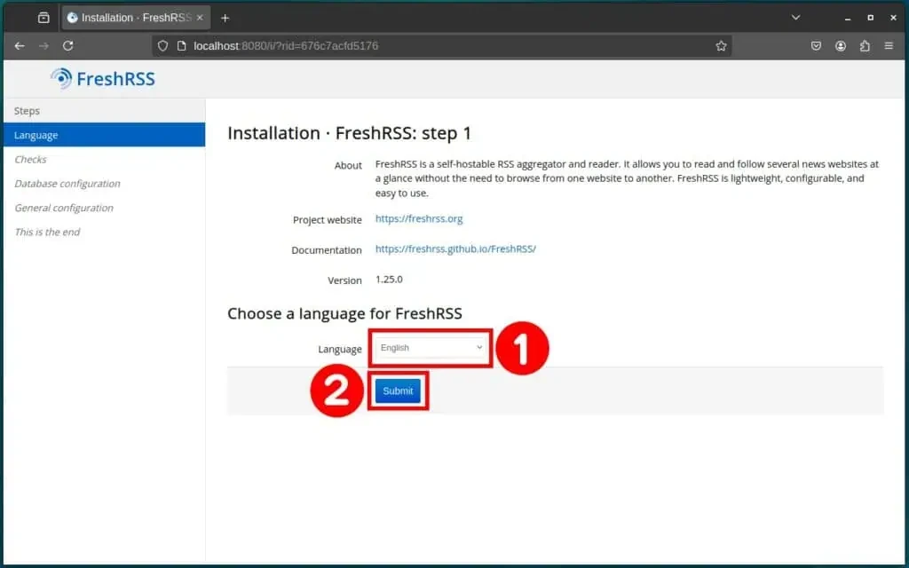 При первом обращении к FreshRSS вам будет предложено выполнить некоторые начальные настройки. Выберите язык по умолчанию, а затем нажмите кнопку Submit, чтобы подтвердить свой выбор.