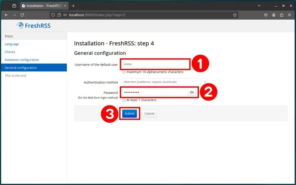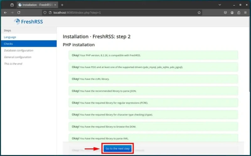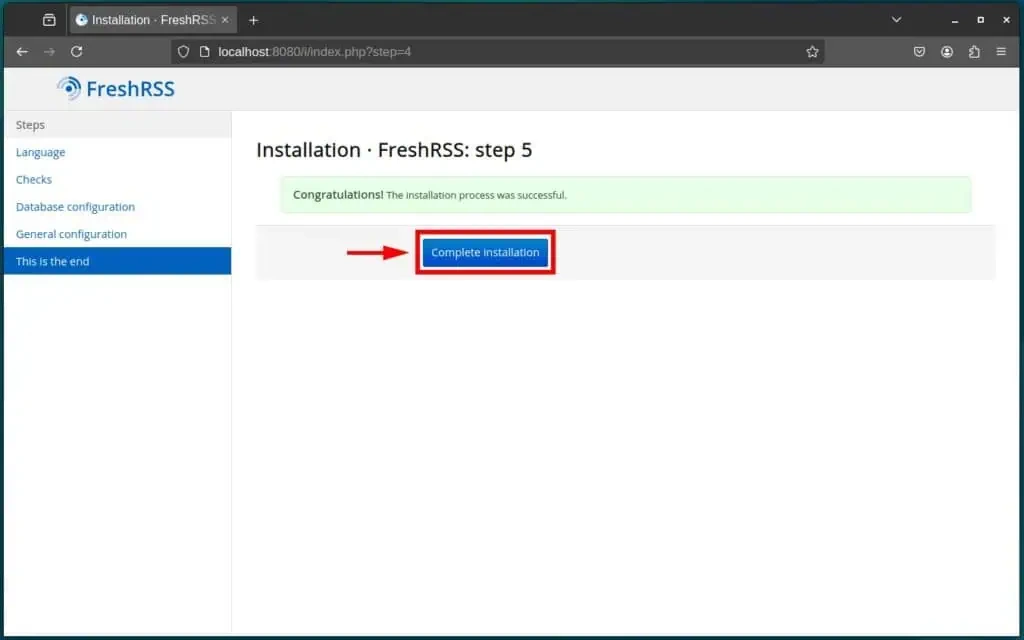 Пока все хорошо. Теперь перейдем к самому интересному. Откройте браузер и перейдите по адресу http://localhost:8080 (если вы обращаетесь к FreshRSS с того же хоста) или http://:8080 (если вы обращаетесь к нему удаленно). Конечно, замените часть __ на IP-адрес вашего сервера.