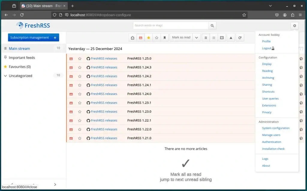 Вот и все, друзья! В этом руководстве я показал вам, как установить и настроить FreshRSS с помощью Docker, приблизив вас к упорядоченной, самостоятельной работе с RSS-каналами.