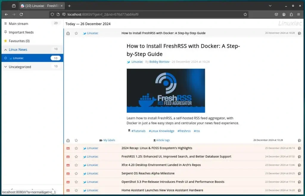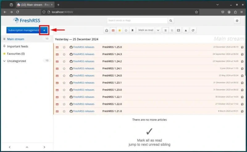 Ваша новая новостная лента была успешно добавлена в агрегатор ленты FreshRSS. Вы можете проделать те же шаги, чтобы добавить любой другой источник новостей, чтобы оставаться в курсе всех новых публикаций.