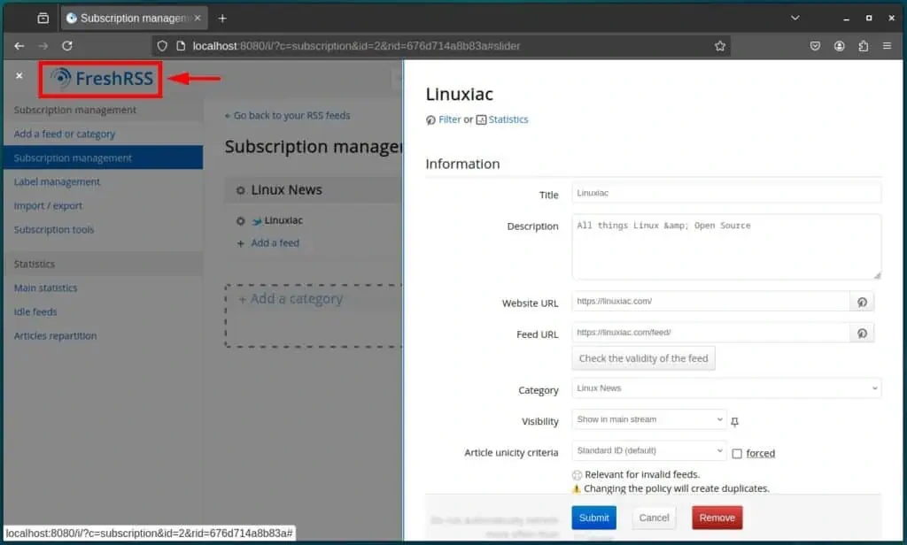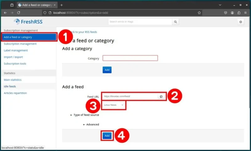 Теперь добавим наш первый источник новостей! Перейдите в меню Добавить канал или категорию. В разделе Добавить канал введите URL RSS-канала (например, https://linuxiac.com/feed/) в поле Адрес канала. Затем выберите категорию из выпадающего списка Категория, и, наконец, нажмите кнопку Добавить для подтверждения.