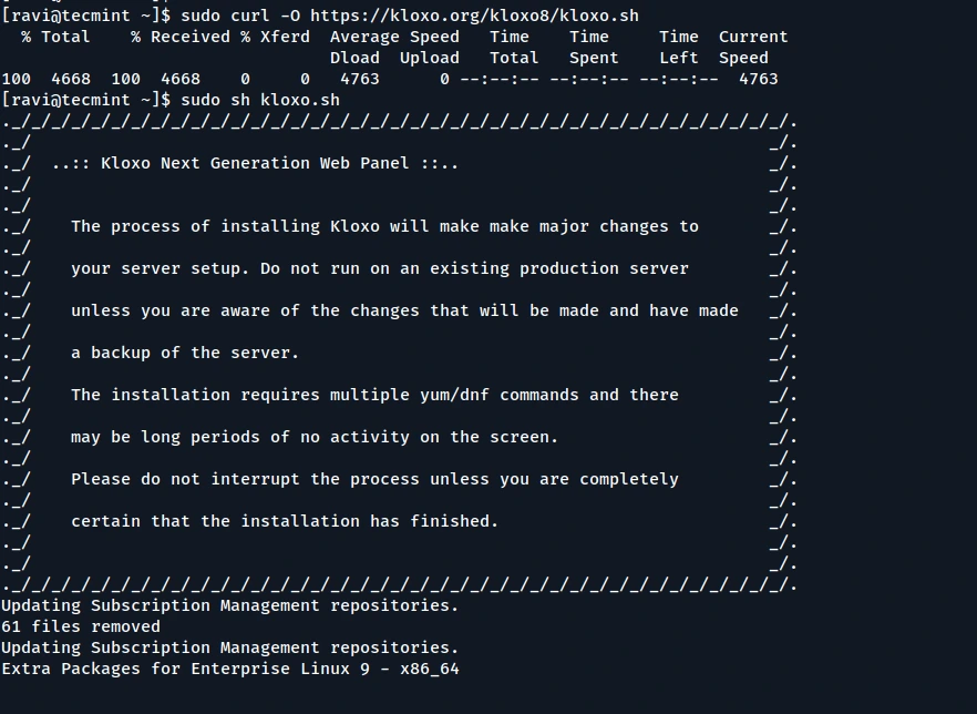 Теперь, когда ваша система готова, пришло время загрузить и запустить скрипт установки Kloxo с помощью следующих команд, который автоматически установит все необходимые компоненты, включая программное обеспечение веб-сервера, базы данных и другие зависимости, необходимые для работы Kloxo.