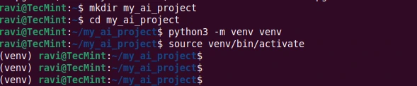 mkdir my_ai_project cd my_ai_project python3 -m venv venv source venv/bin/activate