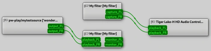 Проверьте граф, например с помощью Qpwgraph, чтобы показать пару поглотитель/источник фильтра. Обратите внимание, что узел поглотителя также имеет порты монитора. Эти порты позволяют просматривать поток перед обработкой. Теперь создайте узел источника, как и раньше: