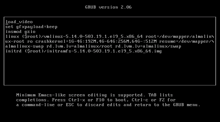 linux /vmlinuz-<version> root=/dev/mapper/almalinux-root ro quiet splash