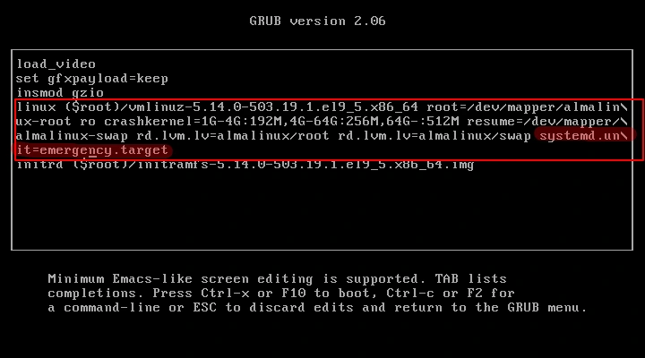 AlmaLinux 8 и AlmaLinux 9, как дистрибутивы на базе RHEL, предоставляют простой способ загрузки в однопользовательский режим через загрузчик GRUB.