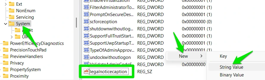 В ключе System щелкните правой кнопкой мыши в правой колонке, выберите New → String Value и назовите его legalnoticecaption.
