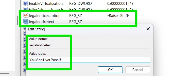 Дважды щелкните на legalnoticecaption и добавьте заголовок сообщения. В поле legalnoticetext добавьте само сообщение.