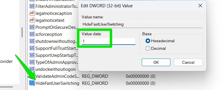 Назовите это значение HideFastUserSwitching, дважды щелкните на нем и установите его значение 1.