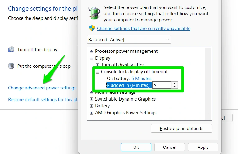 Нажмите Изменить дополнительные параметры питания, перейдите к разделу Дисплей → Время отключения дисплея блокировки консоли и измените значение по своему усмотрению.