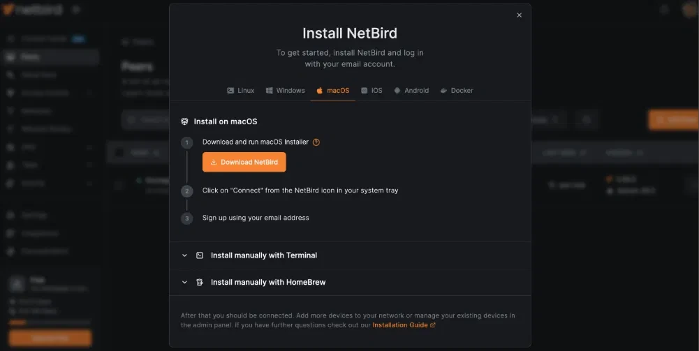 После установки откройте клиент и войдите, используя те же учетные данные, которые вы создали для панели управления NetBird. После аутентификации устройство появится в списке Peers и автоматически получит частный IP-адрес в вашей сети NetBird.