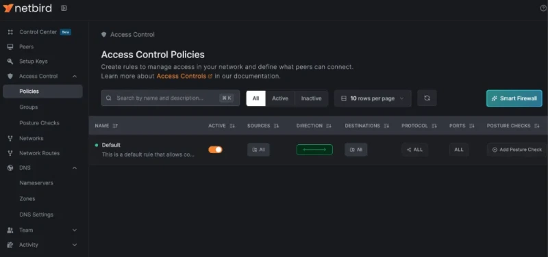 После подключения устройств большая часть взаимодействия с NetBird происходит через веб-панель управления. На панели управления вы можете видеть все устройства в вашей сети и контролировать, как они взаимодействуют друг с другом.