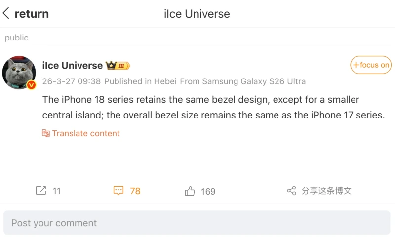 Хотя толщина рамок может остаться прежней, вырез в форме таблетки в верхней части экрана может стать меньше во всех моделях. Серия iPhone 18 сохраняет тот же дизайн рамок, за исключением меньшего центрального островка, — так гласит переведенная Google версия поста инсайдера в Weibo.