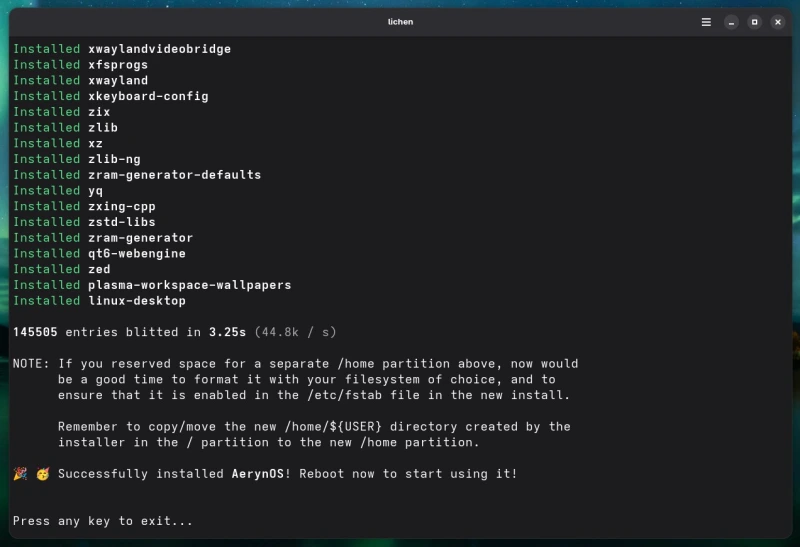 Как и в предыдущих релизах, ISO в первую очередь служит средством для чистой программы установки lichen, которая может устанавливать GNOME, KDE Plasma, COSMIC или окружение только для терминала, всегда извлекая самые новые пакеты из репозиториев AerynOS во время установки.