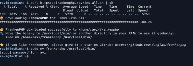 curl https://frankenphp.dev/install.sh | sh sudo mv frankenphp /usr/local/bin/