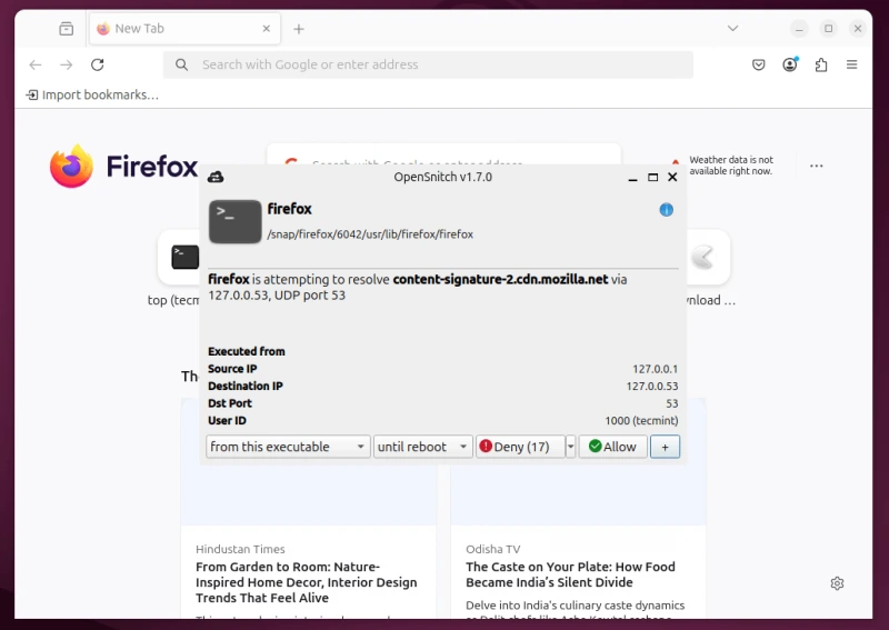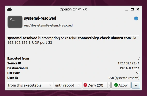 После установки и запуска OpenSnitch отслеживает каждое исходящее соединение, создаваемое вашими приложениями. При первой попытке нового приложения получить доступ к Интернету OpenSnitch выдаст вам всплывающее окно с вопросом, что делать.