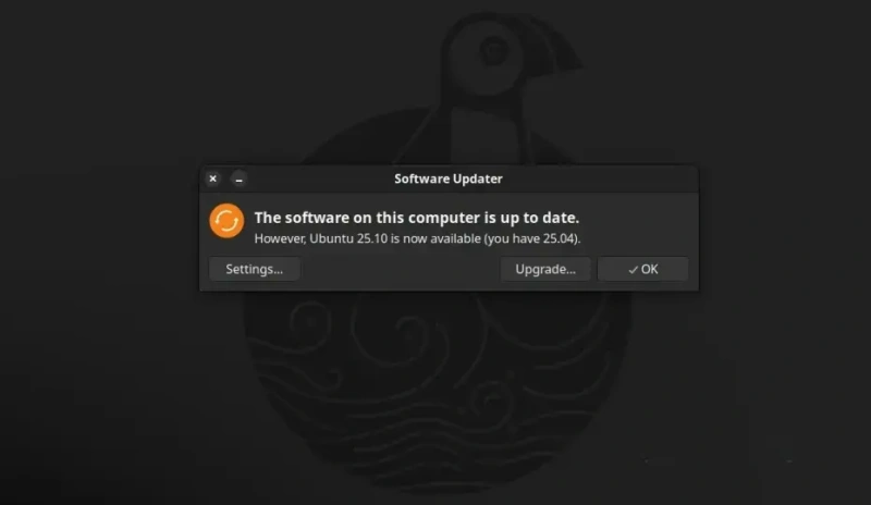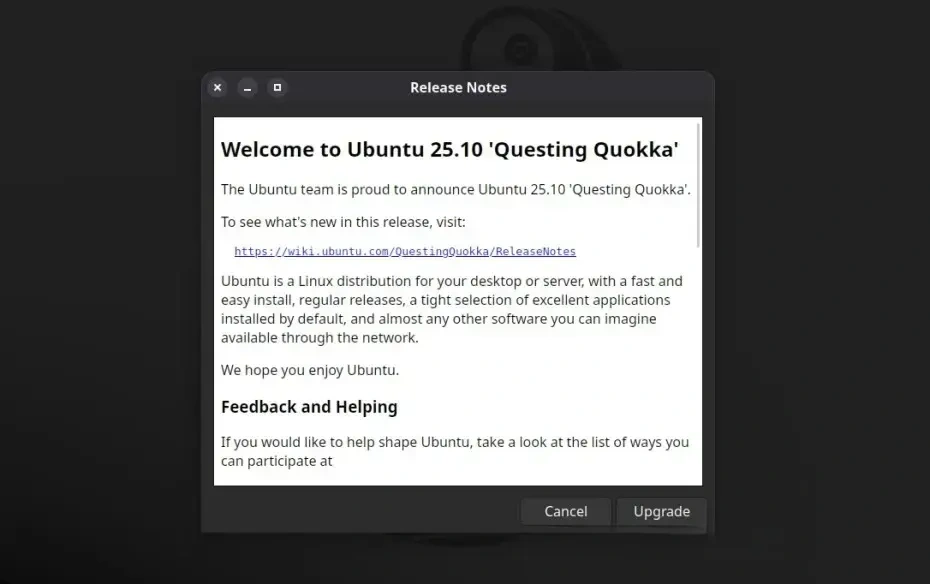 Инструмент Software Updater сообщит вам, что Ubuntu 25.10 уже доступна, поэтому нажмите на кнопку Upgrade, чтобы начать процесс обновления. Затем диалоговое окно с дополнительной информацией о выпуске Ubuntu 25.04. Снова нажмите на кнопку Upgrade, чтобы запустить процесс обновления.