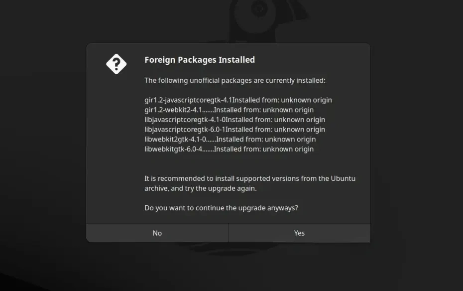 Перед началом обновления вы получите уведомление о том, что некоторые установленные вами сторонние пакеты могут блокировать процесс обновления. Рекомендуется удалить все посторонние пакеты перед обновлением.