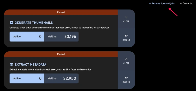 В новой версии также появилась давно востребованная функция на странице администрирования заданий – кнопка «Возобновить все». Она особенно полезна для тех, кто импортирует библиотеки с помощью immich-go, где приостановленные задания иногда оставляют фоновые задачи на месте, пока не будут возобновлены вручную.