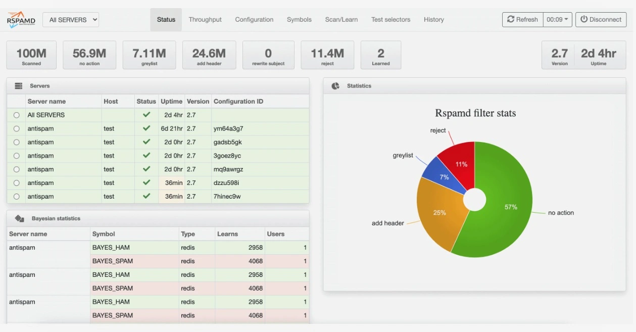 Для тех, кто управляет Rspamd визуально, в версии 3.14 появился полноценный темный режим в веб-интерфейсе, с автоматическим определением темы и ручным переключением. Кроме того, в интерфейсе теперь используются SVG-иконки FontAwesome вместо устаревших Glyphicons, что обеспечивает более чистую и современную эстетику.