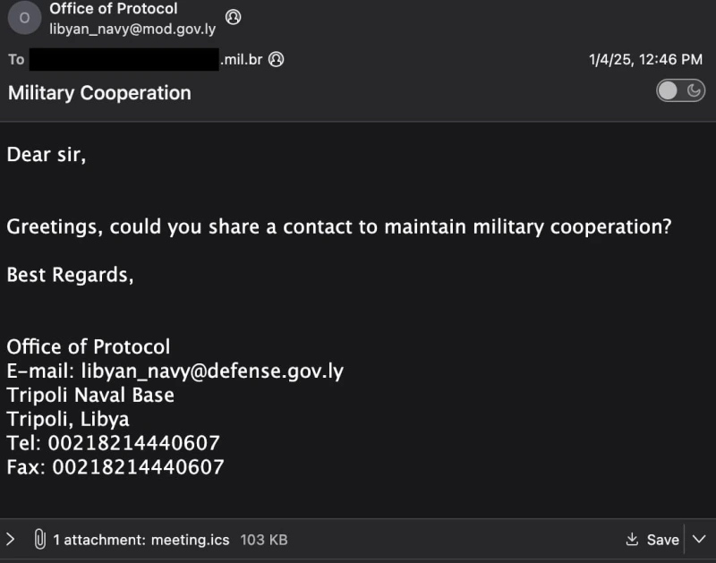Вредоносное письмо содержало ICS-файл размером 00 КБ с JavaScript-файлом, который был обфусцирован с помощью схемы кодирования Base64.