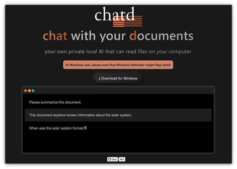 chatd – это настольное приложение, которое позволяет вам общаться с документами локально, используя большую языковую модель.