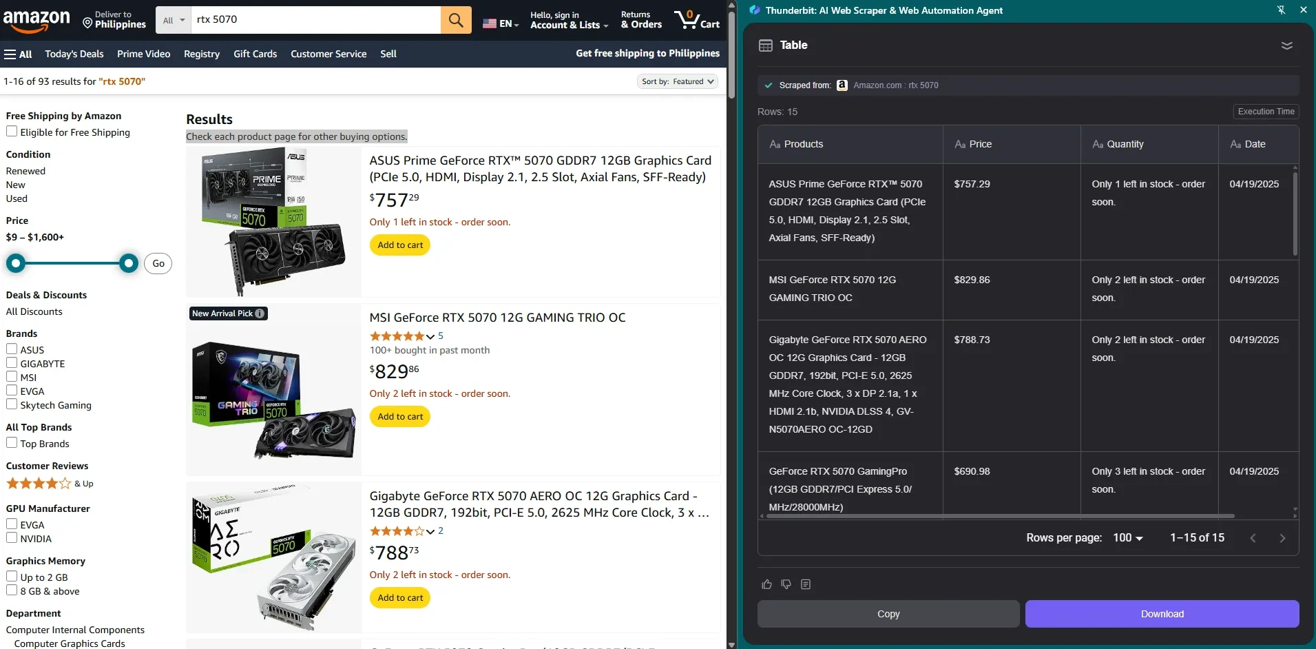 Что делает Thunderbit более надежным веб-скрепером, чем Magical, так это его способность работать с постраничными сайтами. Вместо того чтобы скрести по одной странице за раз, Thunderbit автоматически переходит по нескольким страницам и собирает все необходимые данные. Одна только эта функция сэкономила мне часы при отслеживании объявлений GPU и колебаний цен в течение месяца.