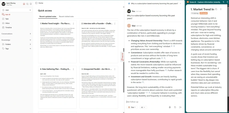 Если ваши заметки разбросаны по всем приложениям или похоронены в длинных документах, Saner.AI изменит ваш подход к организации информации. Я использую Saner.AI, чтобы записывать идеи и заметки о встречах на боковой панели, где его помощник Skai автоматически помечает и упорядочивает все по мере написания.