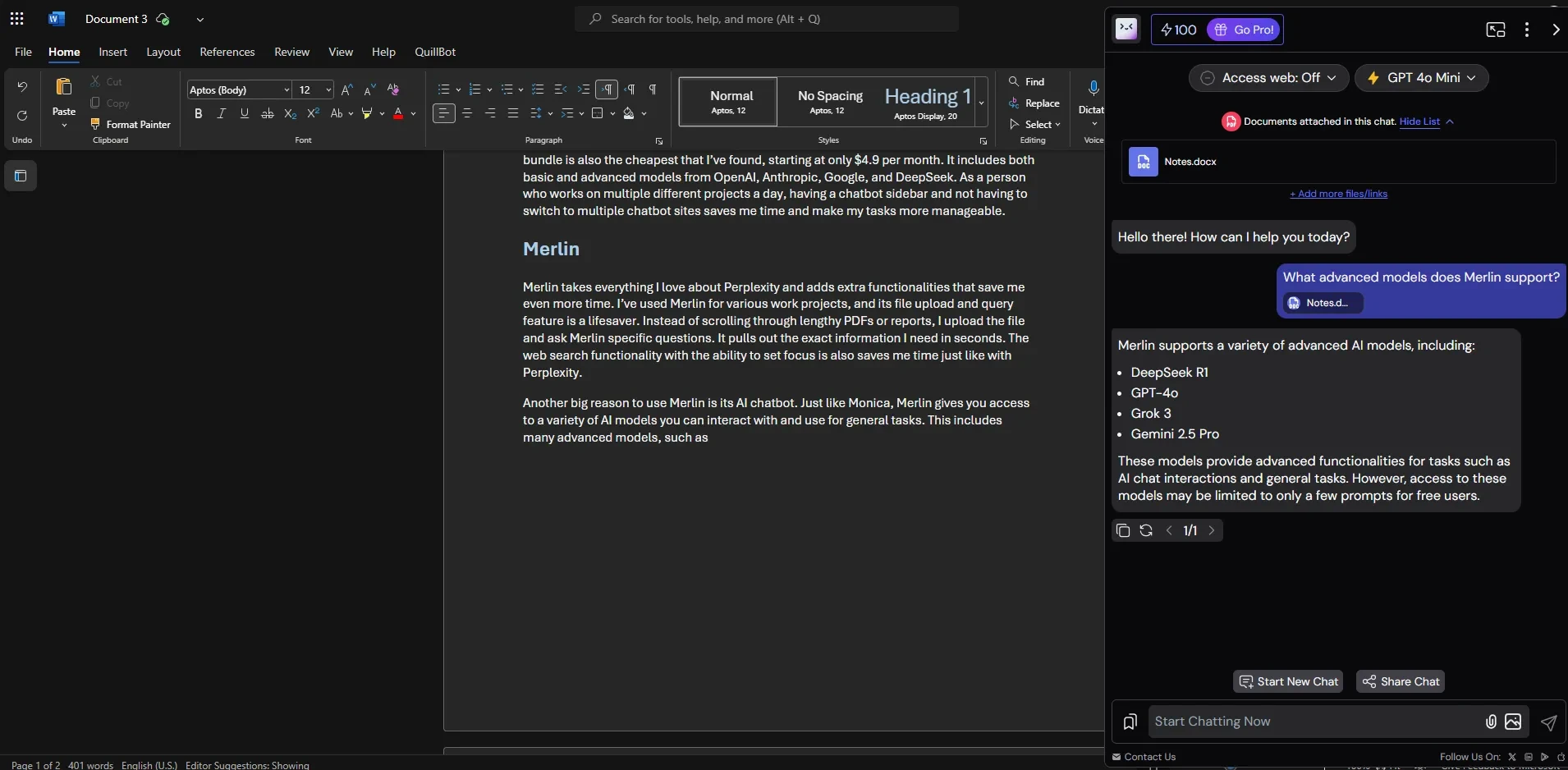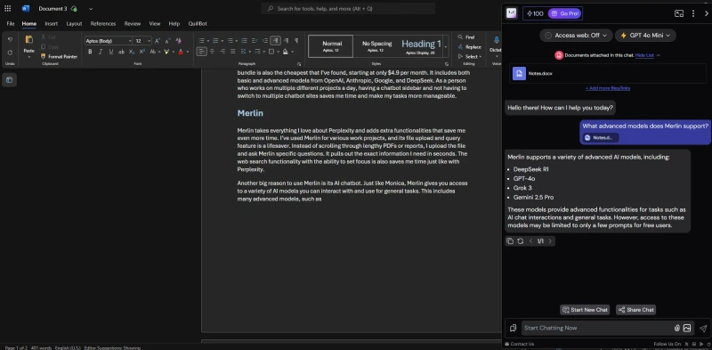 Еще одна веская причина использовать Merlin – его чат-бот с искусственным интеллектом. Merlin предоставляет вам доступ к множеству моделей ИИ, с которыми вы можете взаимодействовать и использовать для решения общих задач. В их число входят многие продвинутые модели, такие как DeepSeek R1, GPT-4o, Grok 3 и Gemini 2.5 Pro, хотя их использование ограничено лишь несколькими подсказками. Если вы хотите использовать эти модели более широко, Merlin предлагает подписку за $29 в месяц, которая дает вам доступ ко всем этим премиум-режимам. Вместо того чтобы переключаться между приложениями, я делаю все в одном месте, что значительно экономит время на сложных проектах.