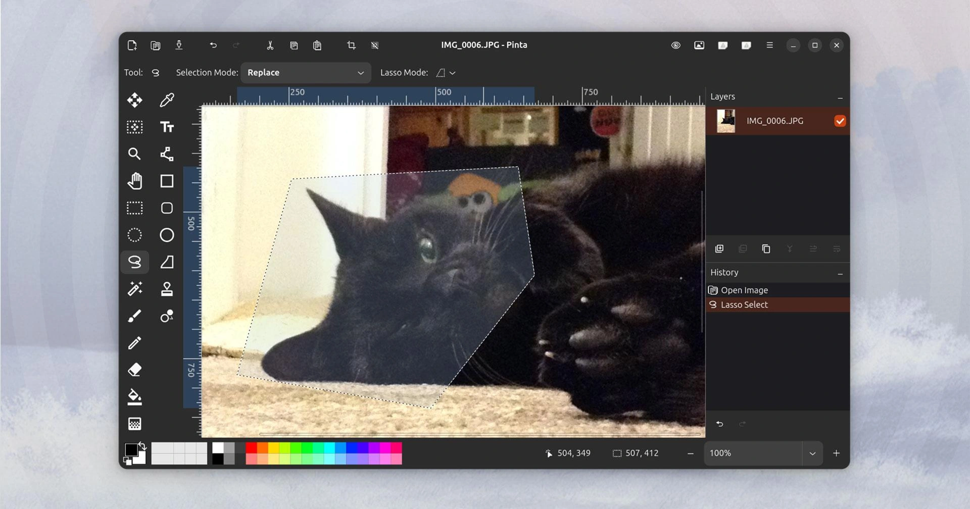 Режим выделения полигонов в действии в Pinta 3.1 Контуры выделения теперь анимированы с помощью марширующих муравьев, чтобы их было легче заметить на холсте; а границы любой области выделения выделяются на линейках холста (если линейки видны, конечно). Оба изменения облегчают выделение пиксельно идеальных областей.
