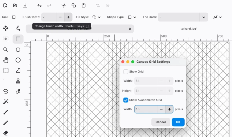Pinta 3.1 добавляет опцию аксонометрической сетки в диалог Вид >> Canvas-сетка…. В ней есть опции для выбора конкретного размера сетки, и она может использоваться наряду со стандартной квадратной сеткой. Аксонометрические сетки используются при создании изометрического рисунка, так как их наклонные линии помогают сохранить правильную перспективу.